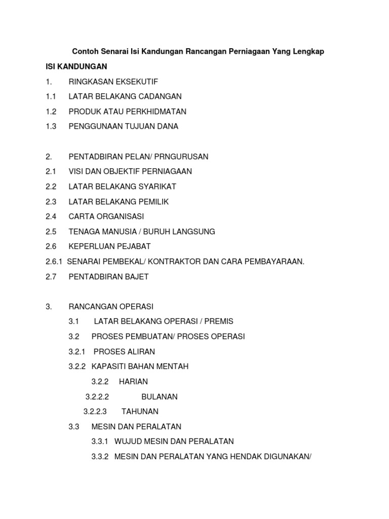 Contoh Senarai Isi Kandungan Rancangan Perniagaan Yang Lengkap Pdf
